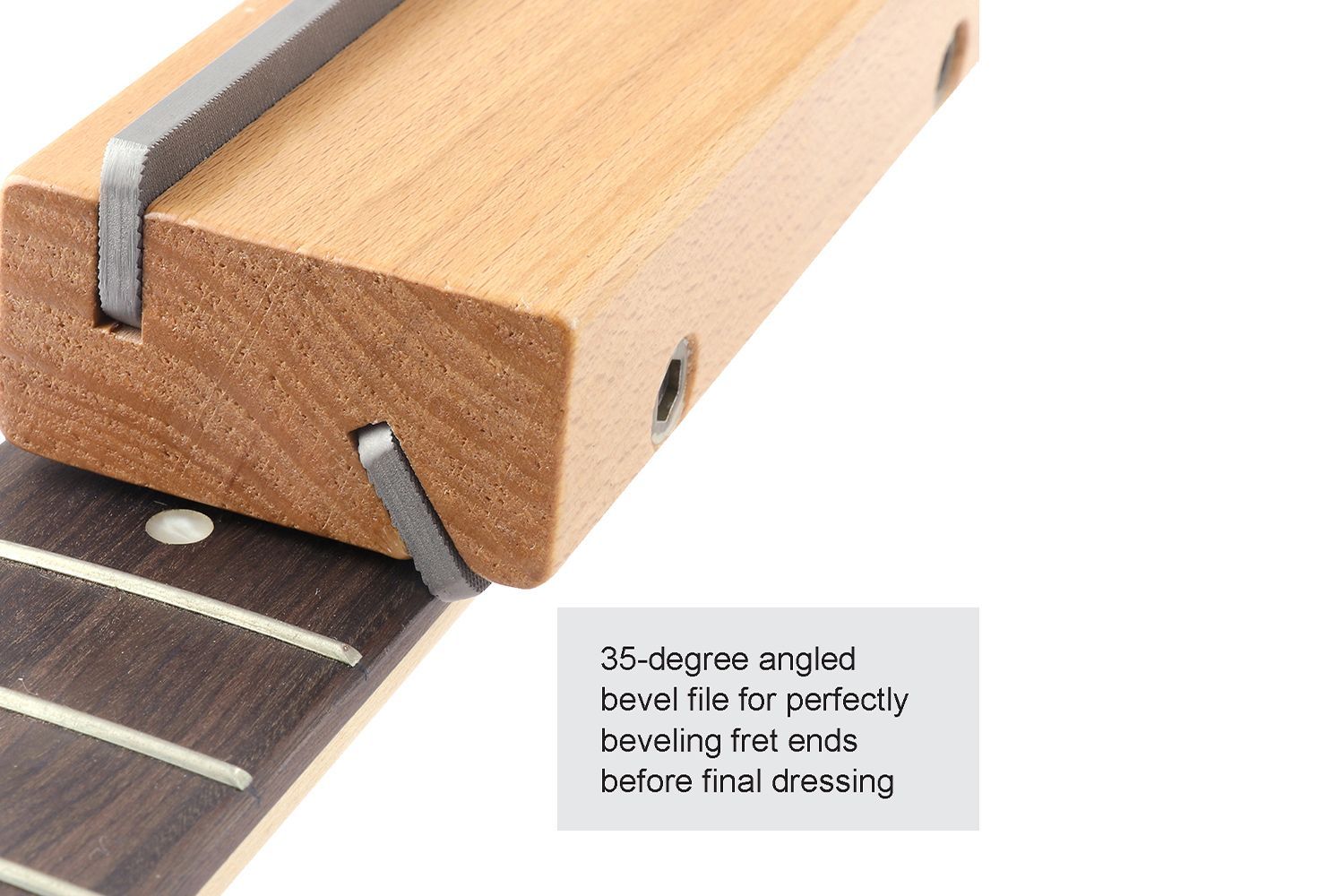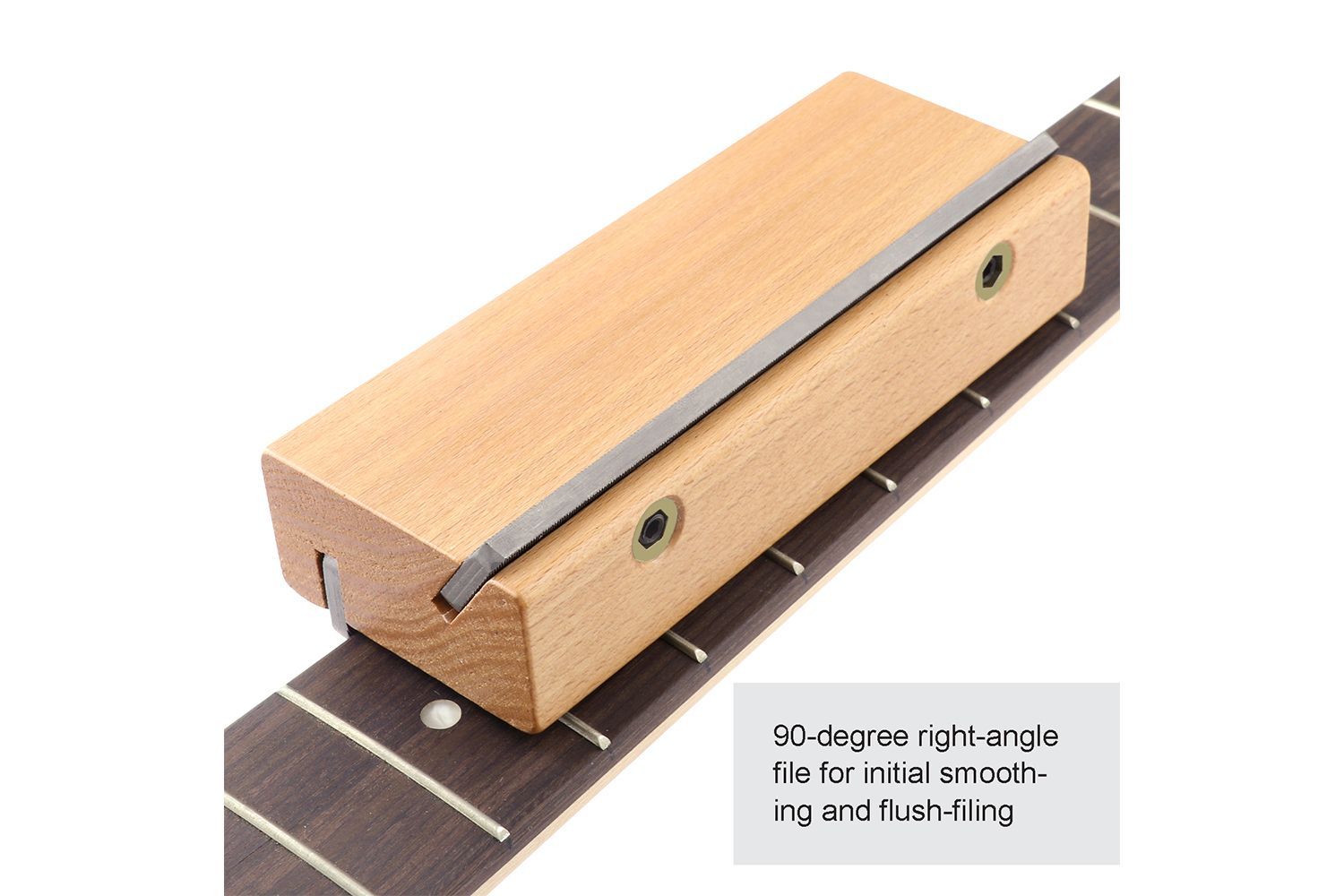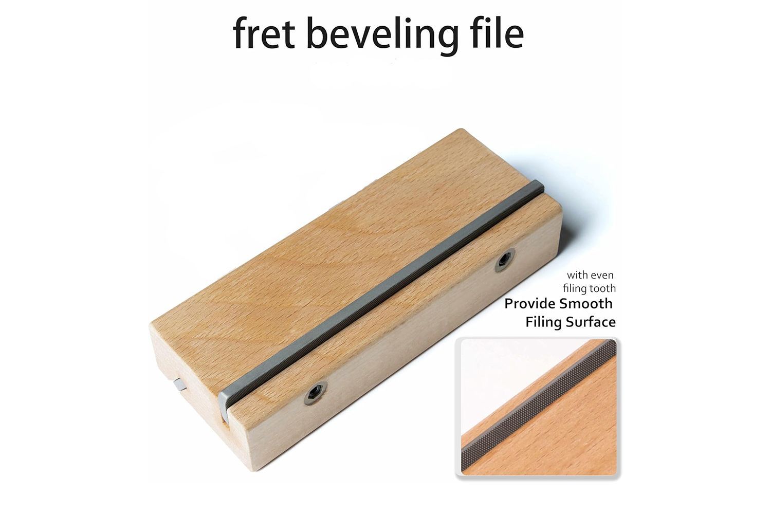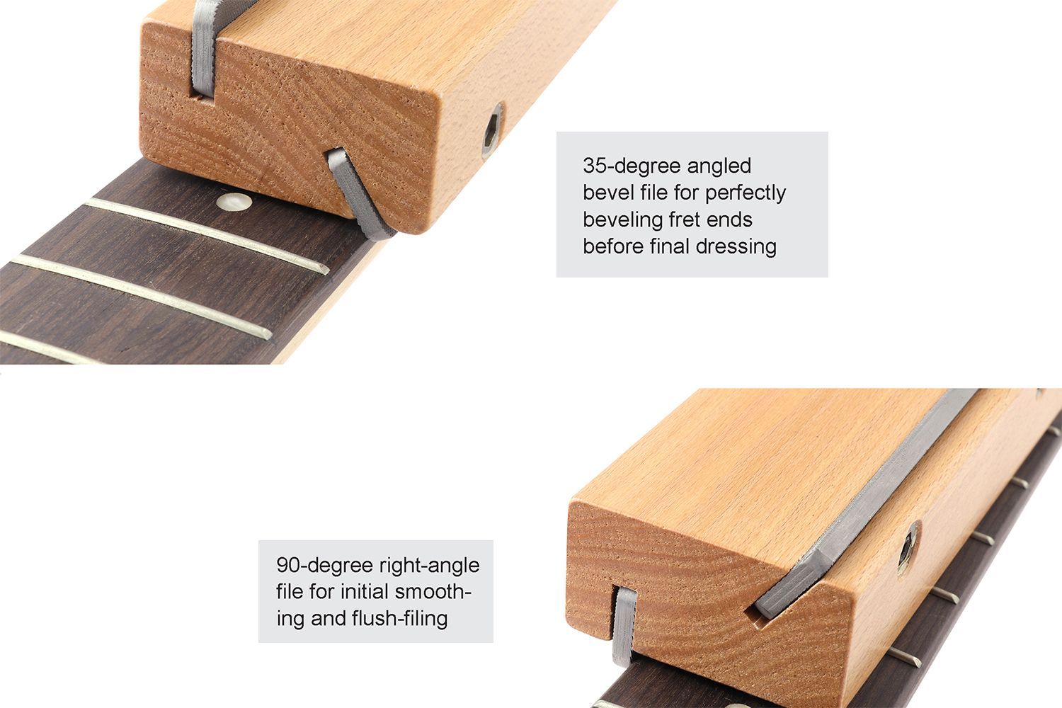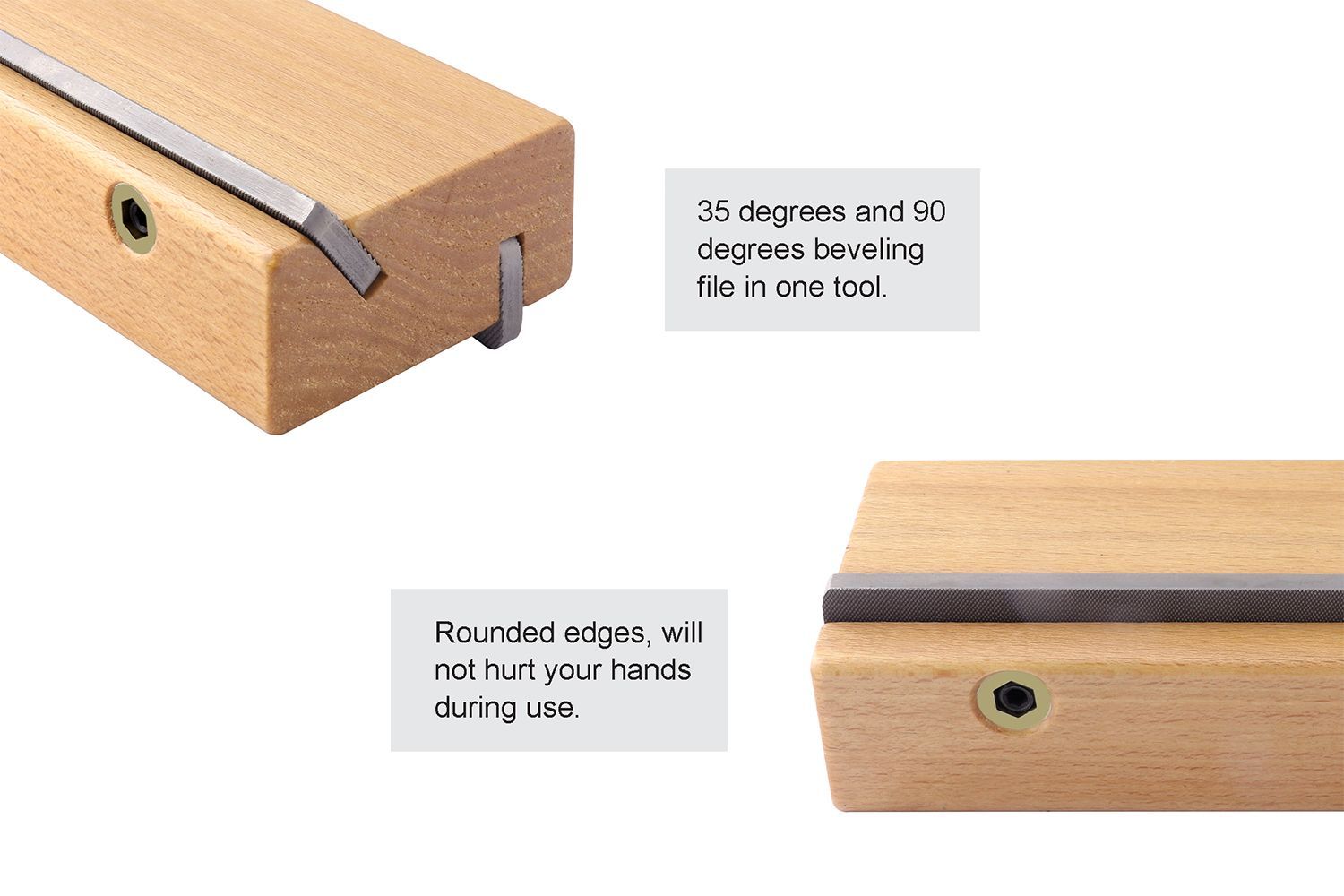 Wooden handle support a smooth and stable feel , one side holds fine-tooth flat file at 90° angle for beveling all the fret ends along the edge of the fingerboard, for initial smoothing and flush-filing. The other side with a 25° angle file used for grinding the bevels at both ends and perfectly beveling fret ends before final dressing.