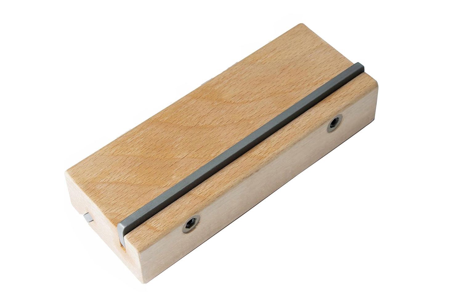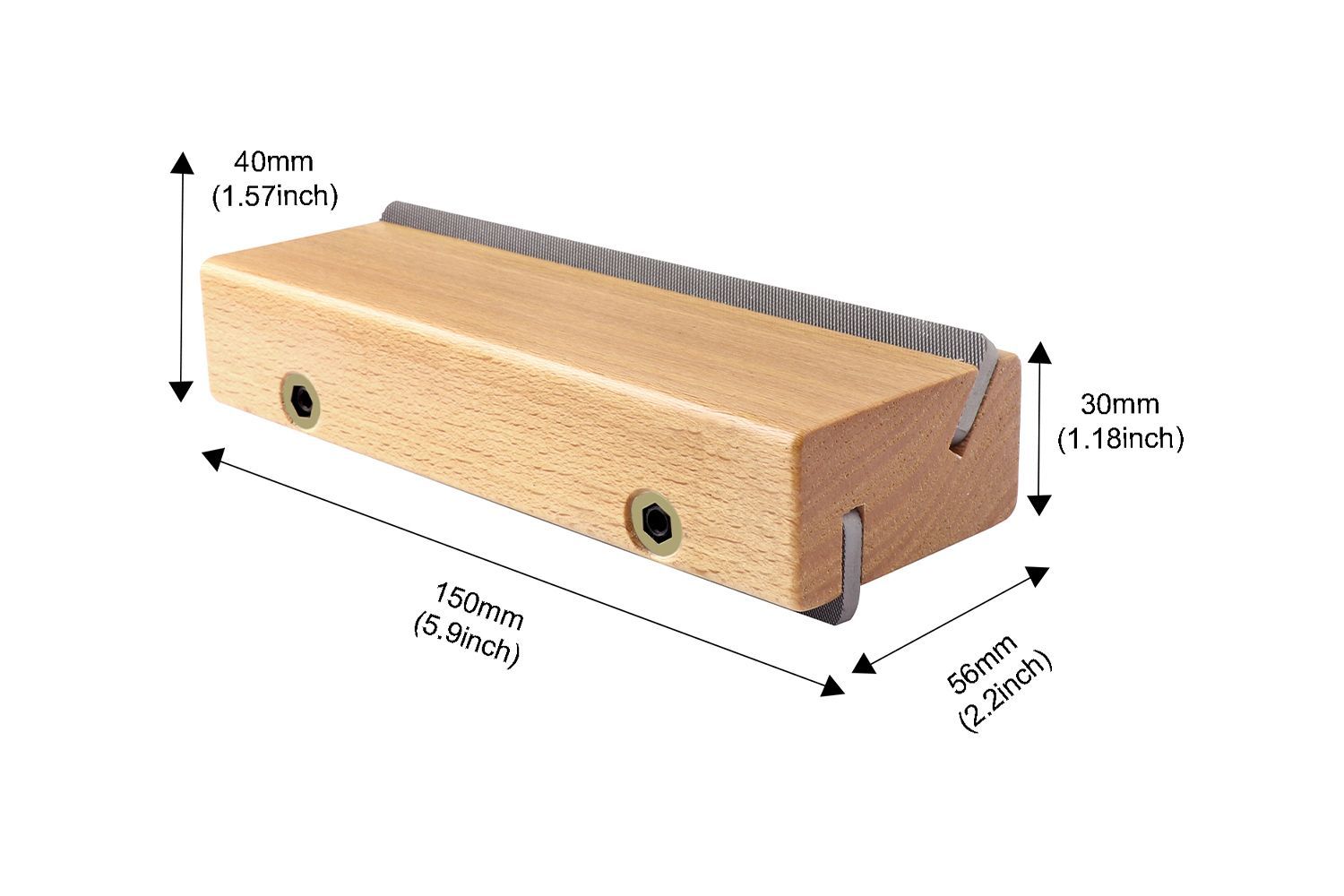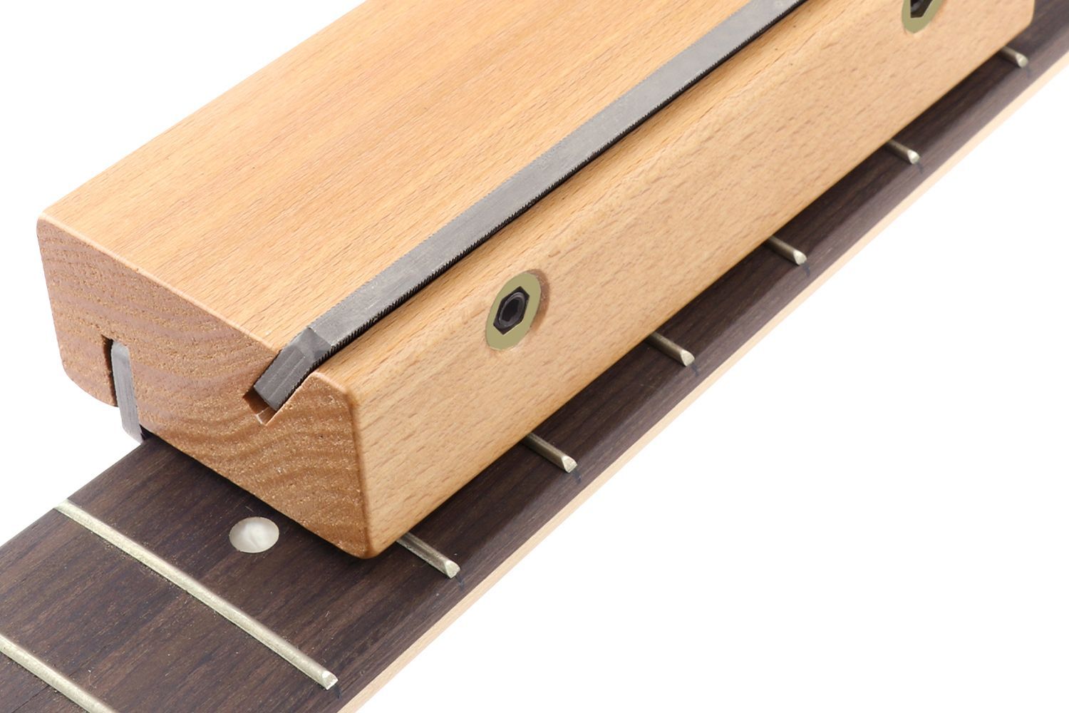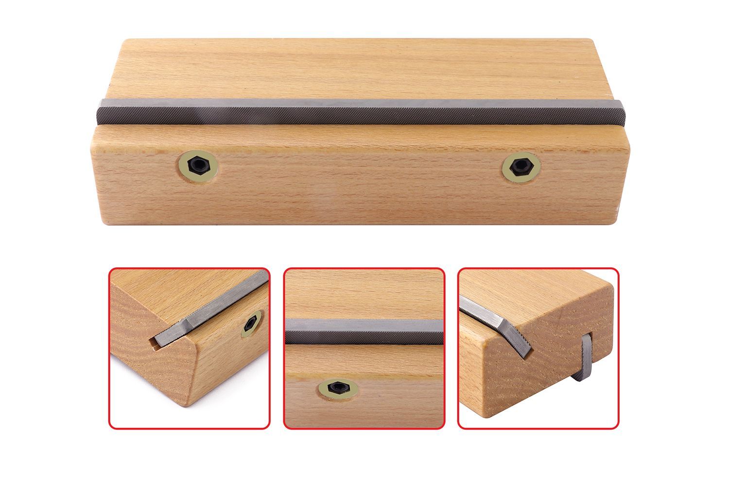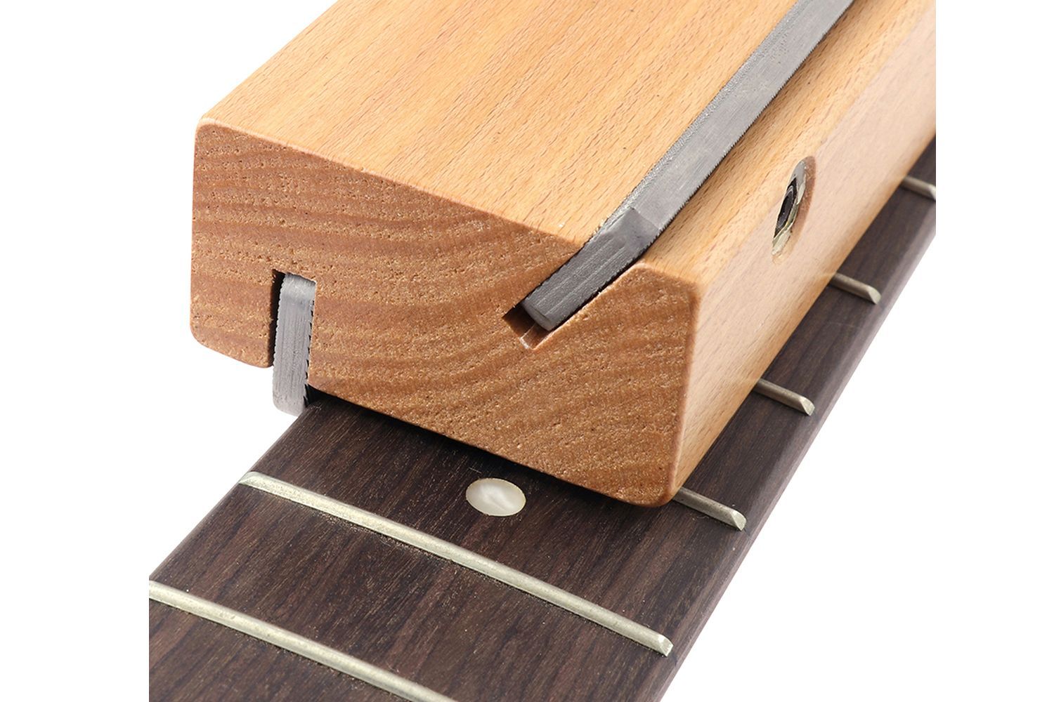 Wooden handle support a smooth and stable feel , one side holds fine-tooth flat file at 90° angle for beveling all the fret ends along the edge of the fingerboard, for initial smoothing and flush-filing. The other side with a 25° angle file used for grinding the bevels at both ends and perfectly beveling fret ends before final dressing.