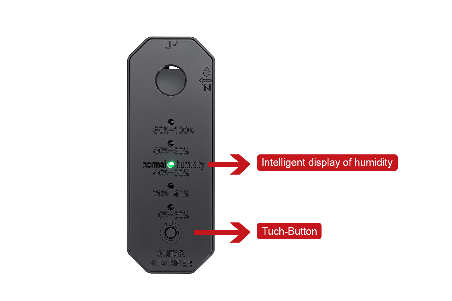 Intelligent display of humidity, add water in a timely manner according to the humidity conditions, to keep your guitar in the suitable humidity .